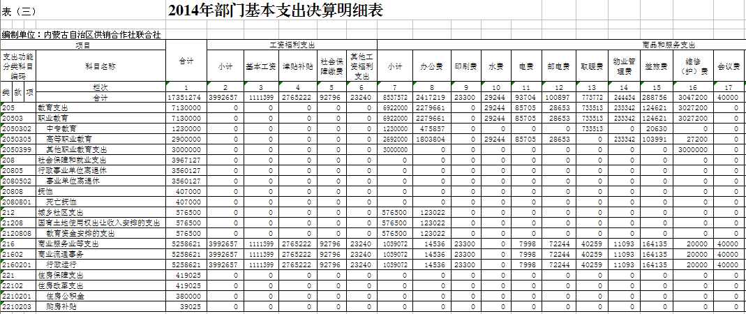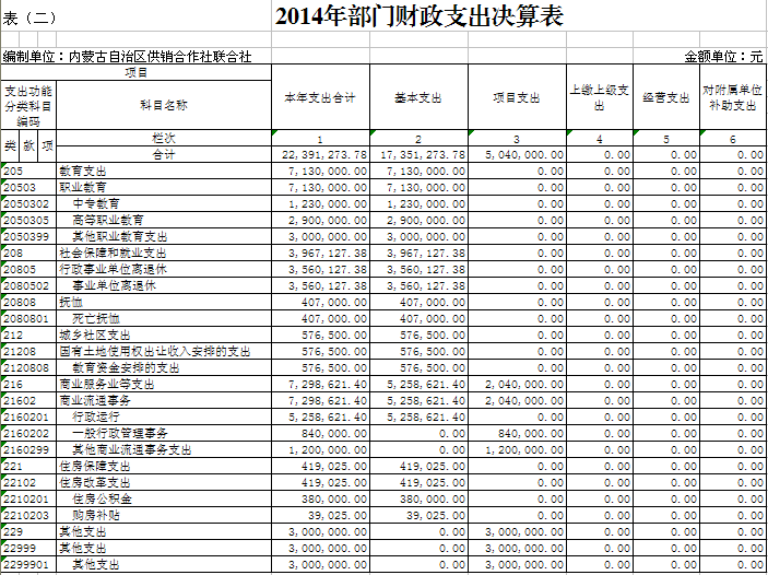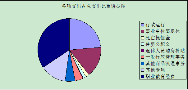 2014年决算支出总额2,239.13万元,其中:行政运行525.86万元,占总支出23.49%;事业单位离退休356.02万元,占总支出15.90%;死亡抚恤40.70万元,占总支出2.68%;住房公积金38万元,占总支出1.82%;一般行政管理事务84万元,占总支出3.75%。其他商品流通事务120万元,占总支出5.36%。退休人员购房补贴3.90万元,占总支出0.18%。其他专项支出300万元,占总支出13.40%。职业教育经费770.65万元,占总支出34.41%。