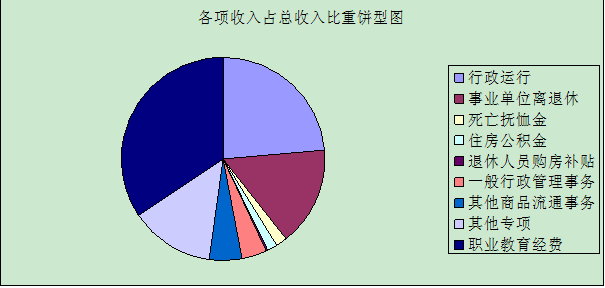 2014年决算收入总额2,239.13万元,其中:行政运行525.86万元,占总收入23.49%;事业单位离退休356.02万元,占总收入15.90%;死亡抚恤40.70万元,占总收入2.68%;住房公积金38万元,占总收入1.82%;一般行政管理事务84万元,占总收入3.75%。其他商品流通事务120万元,占总收入5.36%。退休人员购房补贴3.90万元,占总收入0.18%。其他专项支出300万元,占总收入13.40%。职业教育经费770.65万元,占总收入34.41%。