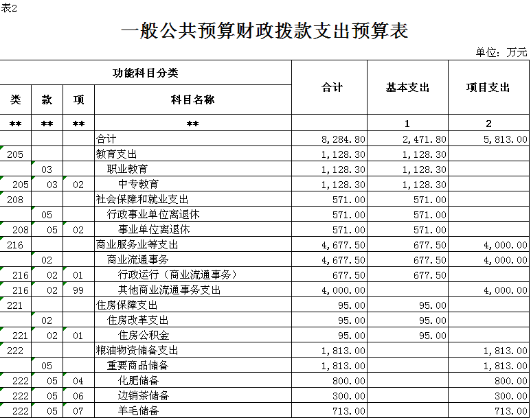 2016年内蒙古供销合作社联合社财政预算拨款总额8284.80万元,相比2015年预算拨款总额8314.80减少30万元。其中:供销社系统专项资金拨款5813万元,专项性公用经费拨款74万元,内蒙古自治区供销合作社(本级)机关经费拨款1044.30万元,内蒙古经贸学校经费拨款1353.50万元;公共财政预算项目转移性资金7400万元;内蒙古经贸学校预算外资金收入290万元。其中: