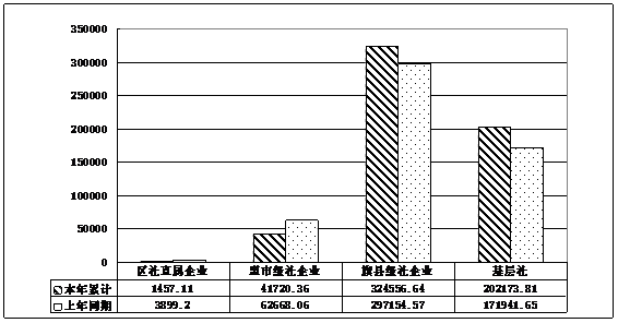 分层级看,区社直属企业汇总实现营业收入1457.11万元,同比减少2442.09万元,下降62.63%,占全系统营业收入的0.26%。盟市级社企业实现营业收入4.17亿元,同比减少2.09亿元,下降33.43%,占全系统营业收入的7.32%;旗县级社企业实现营业收入32.46亿元,同比增加2.74亿元,增长9.22%,占全系统营业收入的56.95%;基层社实现营业收入20.22亿元,同比增加3.02亿元,增长17.58%,占全系统营业收入的35.47%。
