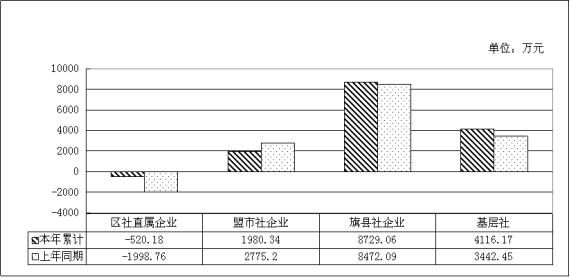 分层级看,区社直属企业利润总额暂体现亏损520.18万元,同比减亏1478.58万元;盟市级社企业实现利润1980.34万元,同比减少794.86万元,下降28.64%;旗县级社企业实现利润8729.06万元,同比增加256.97万元,增长3.03%;基层社实现利润4116.17万元,同比增加673.72万元,增长19.57%。