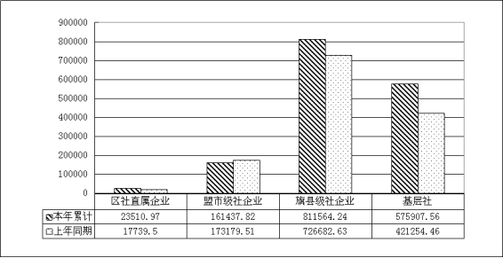 分层级看,区社直属企业汇总实现营业收入2.35亿元,同比增长5771.47万元,增长32.53%,占全系统营业收入的1.5%。盟市级社企业实现营业收入16.14亿元,同比减少1.17亿元,下降6.78%,占全系统营业收入的10.27%;旗县级社企业实现营业收入81.16亿元,同比增加8.49亿元,增长11.68%,占全系统营业收入的51.6%;基层社实现营业收入57.59亿元,同比增加15.47亿元,增长36.71%,占全系统营业收入的36.63%。