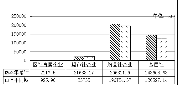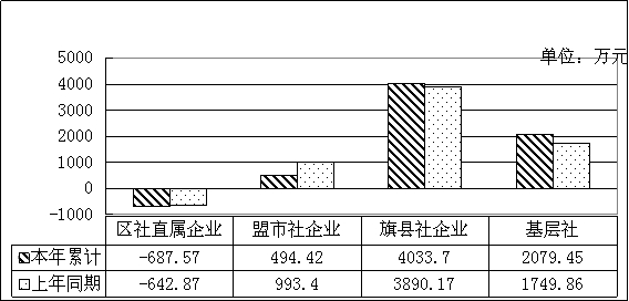 分层级看,区社直属企业利润总额暂体现亏损687.57万元,同比增亏44.7万元;盟市级社企业实现利润494.42万元,同比减少498.98万元,下降50.23%;旗县级社企业实现利润4033.7万元,同比增加143.53万元,增长3.69%;基层社实现利润2079.45万元,同比增加329.59万元,增长18.84%。