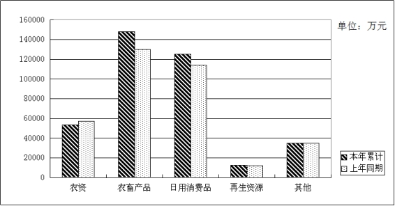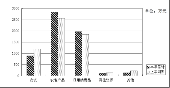 分行业看,“四大网络”企业营业收入33.93亿元,同比增加2.6亿元,增长8.29%,占全系统营业收入的90.72%。其中,农资企业实现营业收入5.35亿元,同比减少3769.78万元,下降6.58%,占全系统营业收入的14.3%;农畜产品企业实现营业收入14.8亿元, 同比增加1.81亿元,增长13.93%,占全系统营业收入的39.58%;日用消费品企业实现营业收入12.53亿元,同比增加1.11亿元,增长9.76%,占全系统营业收入的33.49%;再生资源企业实现营业收入1.25亿元,同比增加507.65万元,增长4.23%,占全系统营业收入的3.34%;其他业务企业实现营业收入3.47亿元,同比增加85.72万元,增长0.25%,占全系统营业收入的9.28%。