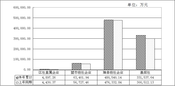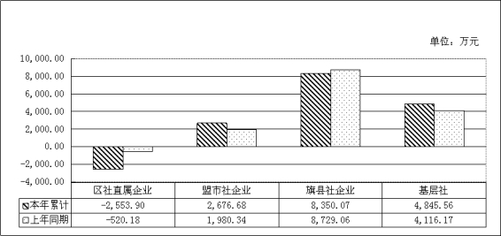 分层级看,区社直属企业利润总额暂体现亏损2553.9万元,同比增亏2033.72万元(其中农资公司因化肥销售入账时间差异同比增亏1693万元;牧王公司同比增亏221万元;合信公司暂未体现收益同比减少203万元);盟市级社企业实现利润2676.68万元,同比增加696.34万元,增长35.16%(通辽同比减少403万元;鄂尔多斯市同比减少250万元);旗县级社企业实现利润8350.07万元,同比减少378.99万元,下降4.34%;基层社实现利润4845.56万元,同比增加729.39万元,增长17.72%。