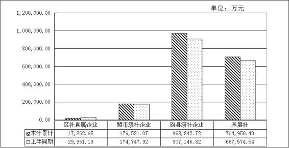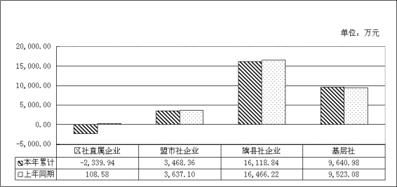 分层级看,区社直属企业利润总额暂体现亏损2339.94万元,同比增亏2448.52万元;盟市级社企业实现利润3468.36万元,同比减少168.74万元,下降4.64%;旗县级社企业实现利润1.61亿元,同比减少347.38万元,下降2.11%;基层社实现利润9640.98万元,同比增加117.9万元,增长1.24%。