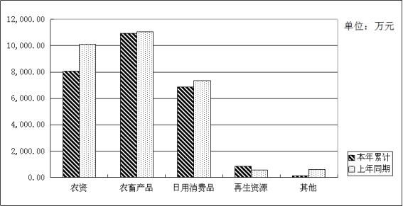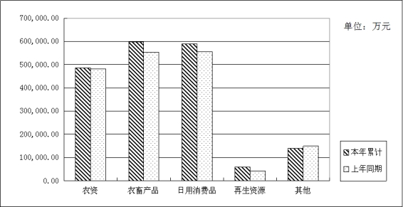 分行业看,“四大网络”企业营业收入173.08亿元,同比增加10.04亿元,增长6.16%,占全系统营业收入的92.5%。其中,农资企业实现营业收入48.62亿元,同比增加5439.8万元,增长1.13%,占全系统营业收入的25.98%;农畜产品企业实现营业收入59.66亿元, 同比增加4.4亿元,增长7.96%,占全系统营业收入的31.89%;日用消费品企业实现营业收入58.88亿元,同比增加3.37亿元,增长6.06%,占全系统营业收入的31.46%;再生资源企业实现营业收入5.92亿元,同比增加1.73亿元,增长41.46%,占全系统营业收入的3.16%;其他业务企业实现营业收入14.04亿元,同比减少8678.52万元,下降5.82%,占全系统营业收入的7.5%。
