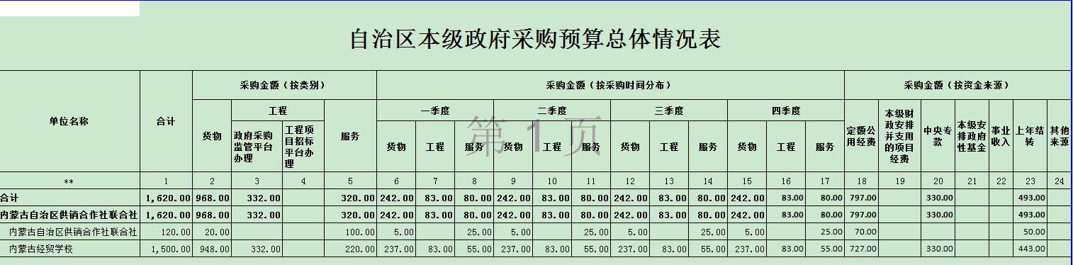 自治区供销合作社(机关)2019年政府采购计划预算资金总计120万元,其中货物类20万元,服务类100万元。