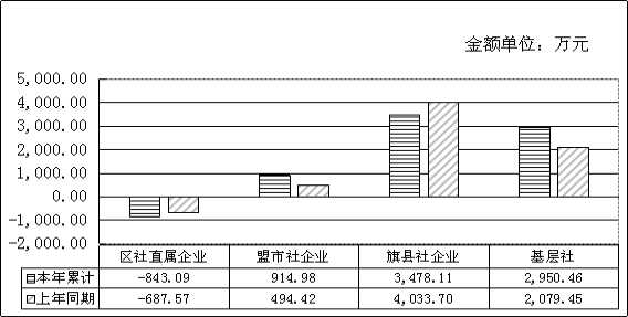 分层级看,区社直属企业利润总额暂体现亏损843.09万元,同比增亏155.52万元;盟市级社企业实现利润914.98万元,同比增加420.56万元,增长85.06%;旗县级社企业实现利润3478.11万元,同比减少555.59万元,下降13.77%;基层社实现利润2950.46万元,同比增加871.01万元,增长41.89%。