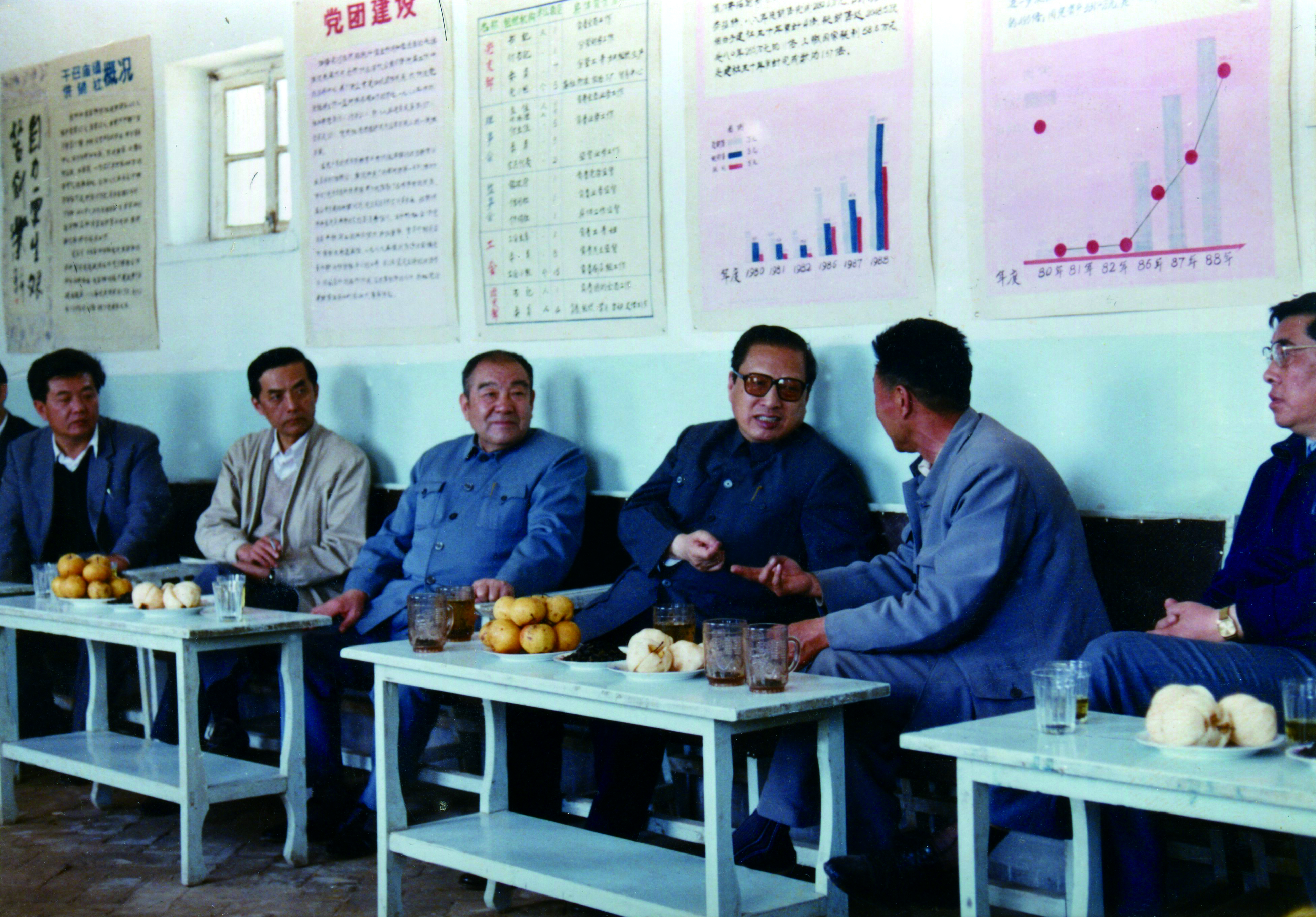 1990年5月,乔石同志(右三)视察巴盟临河干召庙基层供销合作社