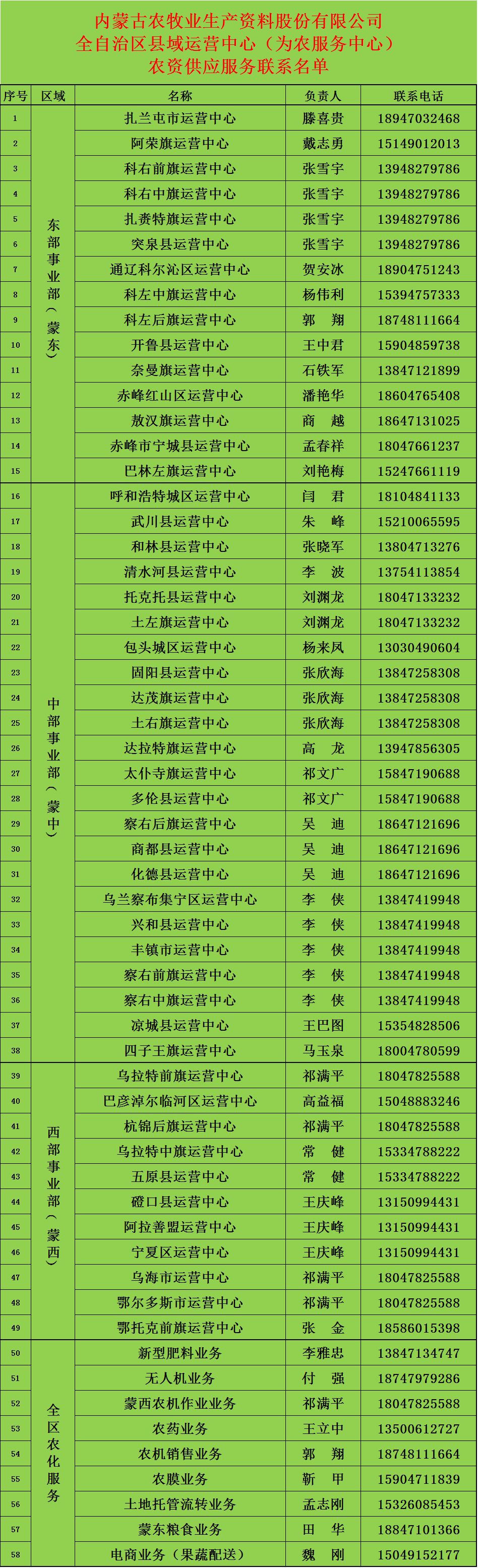 内蒙农资公司及时印发了《关于做好疫情防控期间春耕农资商品保供稳价工作的通知》,对全力做好内蒙古春耕农资供应工作进行了安排部署,要求各部门迅速行动,尽锐出战,提高站位,强化担当,敞开供应,保障供给,发挥农资公司供销社压舱石、稳定器的作用,展国企实力,树供销形象。现对内蒙农资所属自治区县域运营中心(为农服务中心)农资供应服务联系名单予以公布,以便于全区农牧民购买优质化肥等农资商品和农化服务,战疫情、保春耕,坚决打赢我区春耕备耕保卫战。