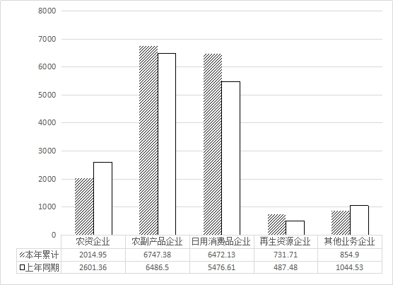 分行业看,“四大网络”企业营业总收入94.78亿元,同比增加4.64亿元,增长5.14%,占全系统营业收入的92.51%。农资企业营业总收入25.86亿元,同比增长11.23%,占全系统营业总收入的25.24%;农副产品企业营业总收入33.17亿元,同比增长2.61%,占全系统营业总收入的32.38%;日用消费品企业营业总收入32.19亿元,同比增长0.2%,占全系统营业总收入的31.42%;再生资源企业营业总收入3.56亿元,同比增长45.72%,占全系统营业总收入的3.48%;其他业务企业营业总收入7.68亿元,同比下降17.46%,占全系统营业总收入的7.49%。