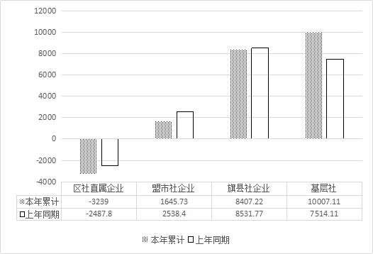 分层级看,区社直属企业汇总实现利润总额-3239万元,同比增亏751.2万元。盟市级社企业实现1645.73万元,同比减少892.67万元,下降35.17%;旗县级社企业实现8407.22万元,同比减少124.55万元,下降1.46%;基层社实现1亿元,同比增加2493万元,增长33.18%。