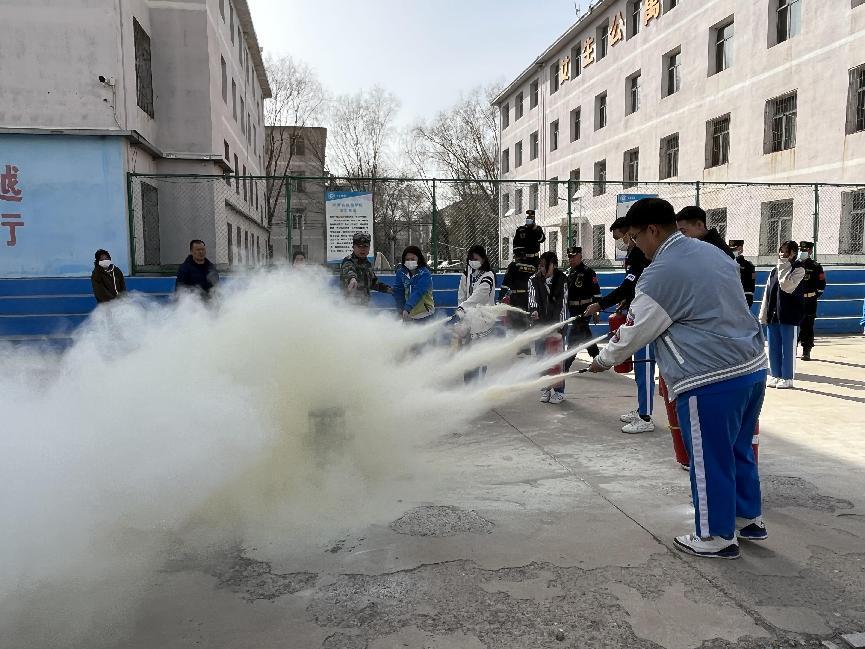 消防队讲解员为全体师生讲解了干粉灭火器和消防水带的使用方法,师生们认真观看了使用步骤,部分师生参与了现场操作。
