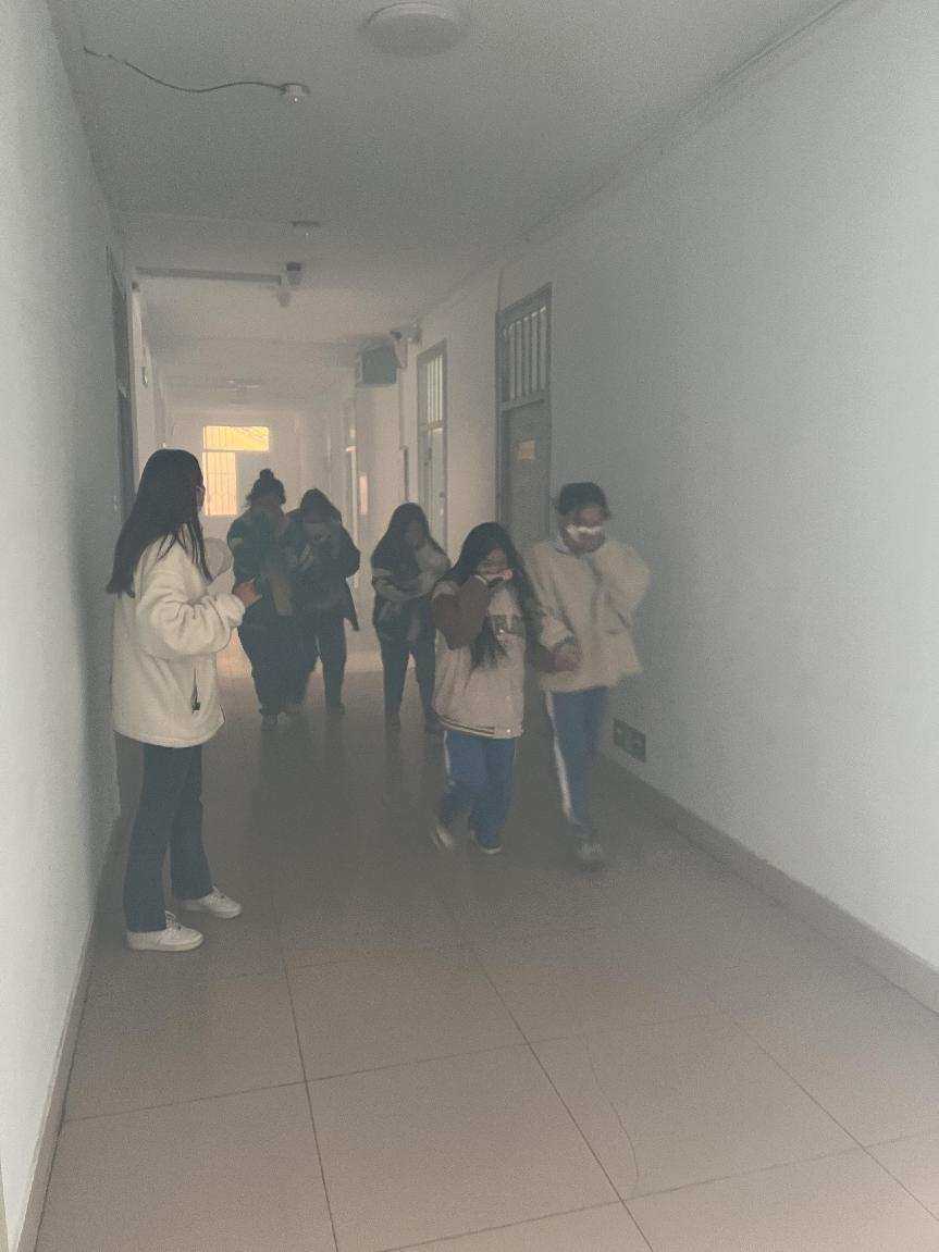 随着消防警铃响起,全体师生立即提高警觉,学生们在老师的组织下,捂住口鼻,弯腰低身前行、有序的按照逃生路线逃生。老师们在楼梯口、安全出口等地点做好维护工作,确保学生安全撤离。队伍的撤离始终安静而有秩序,全校师生安全顺利的撤离到指定场地。参加的师生基本做到了操作规范、方法正确、态度端正、扑救有效的演练要求,达到了预期的效果。