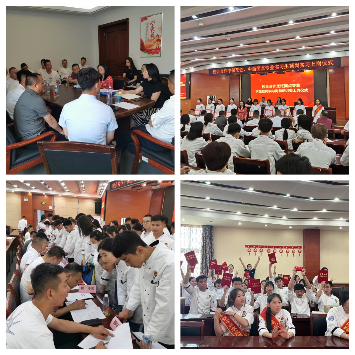 2023年6月16日上午,内蒙古浩翔餐饮管理有限公司(以下简称浩翔企业)各店集中到内蒙古经贸学校迎接中餐烹饪、中西面点专业学生赴企实习。校企双方在二楼会议室召开了“学生实习工作对接会”,就实习岗位及学生情况进行深入交流,落实落细相关具体工作。同时在五楼会议室开展了“实习生岗前培训暨上岗仪式”。