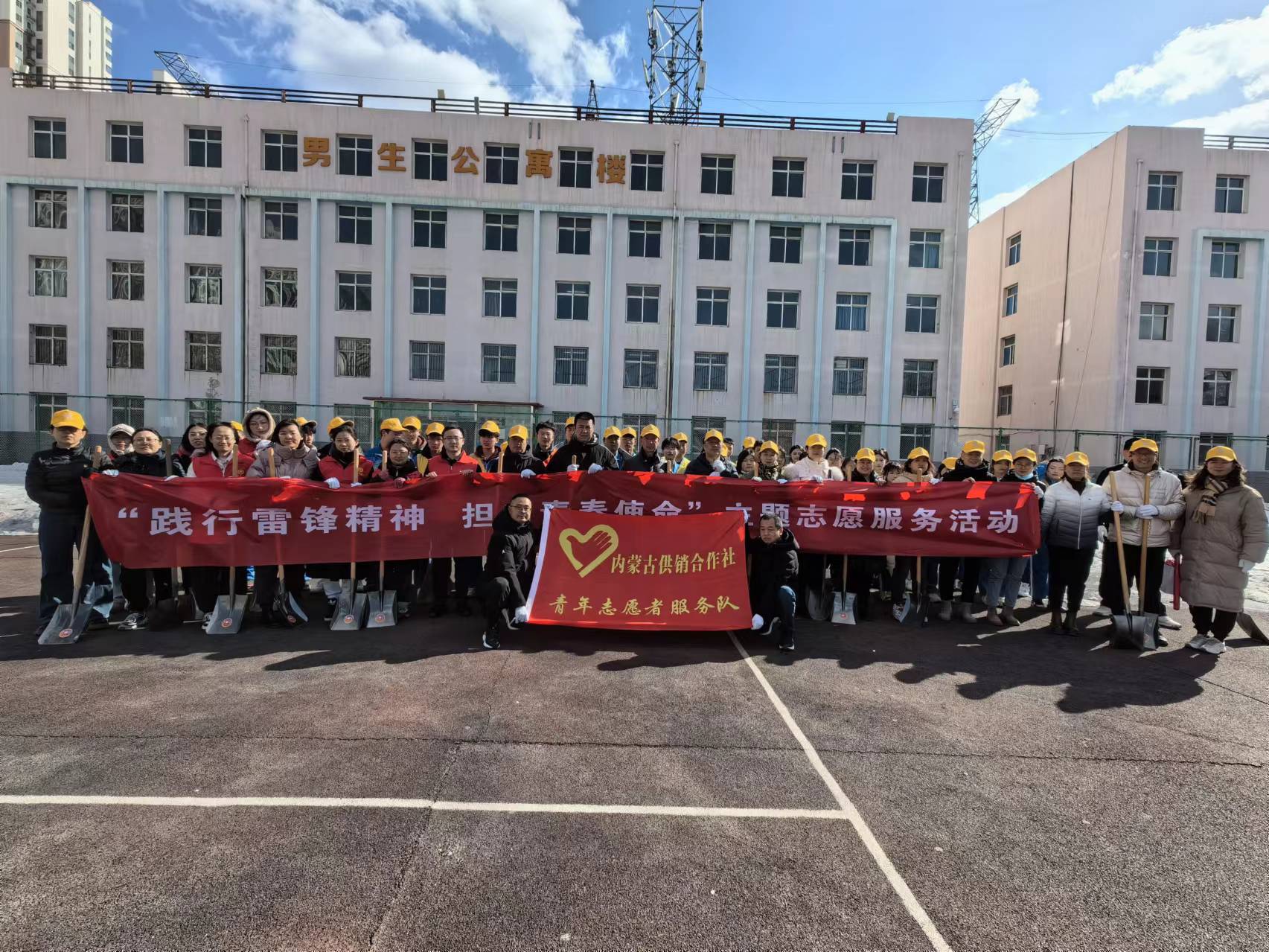 由于寒假期间连续多场降雪,区社直属的内蒙古经贸学校操场背阴面堆积了厚厚一层积雪急需清理,区社机关从立足本职服务基层、服务企业、服务群众的角度,以开展学雷锋志愿服务活动为契机,及时对接经贸学校组织开展清除积雪志愿服务。清雪活动中,区社机关党员干部以身作则,带头发扬“奉献、友爱、互助、进步”的志愿服务精神,拿着铁锹铲除坚冰、挥动扫帚清扫积雪,学生团员们也纷纷付诸行动,推来垃圾清运车及时清运积雪,打扫“战场”!通过全体志愿者齐心协力,积雪覆盖的操场不一会儿就恢复了原貌,大家用不怕苦、不怕累的实际行动践行了雷锋精神、展现了新时代供销合作社人的精神风貌。