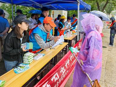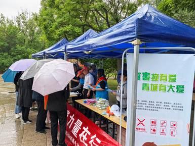 活动现场,大家架起雨棚,放置好长桌、展板,挂上条幅,摆放好生活垃圾分类宣传手册和纸巾、笔记本、中性笔、帽子、台历等宣传小礼品,设置生活垃圾分类普及与知识问答点,工作人员们热情邀请群众、游客参与垃圾分类知识问答游戏,通过趣味性的互动游戏进一步拉近与群众的距离,提升了对垃圾分类知识学习的积极性和主动性。同时还积极向公园群众发放生活垃圾分类宣传单,引导群众关注“分类行”小程序,并详细介绍如何区分可回收物、厨余垃圾、其他垃圾、有害垃圾以及分类垃圾桶对应的颜色等垃圾分类知识。
