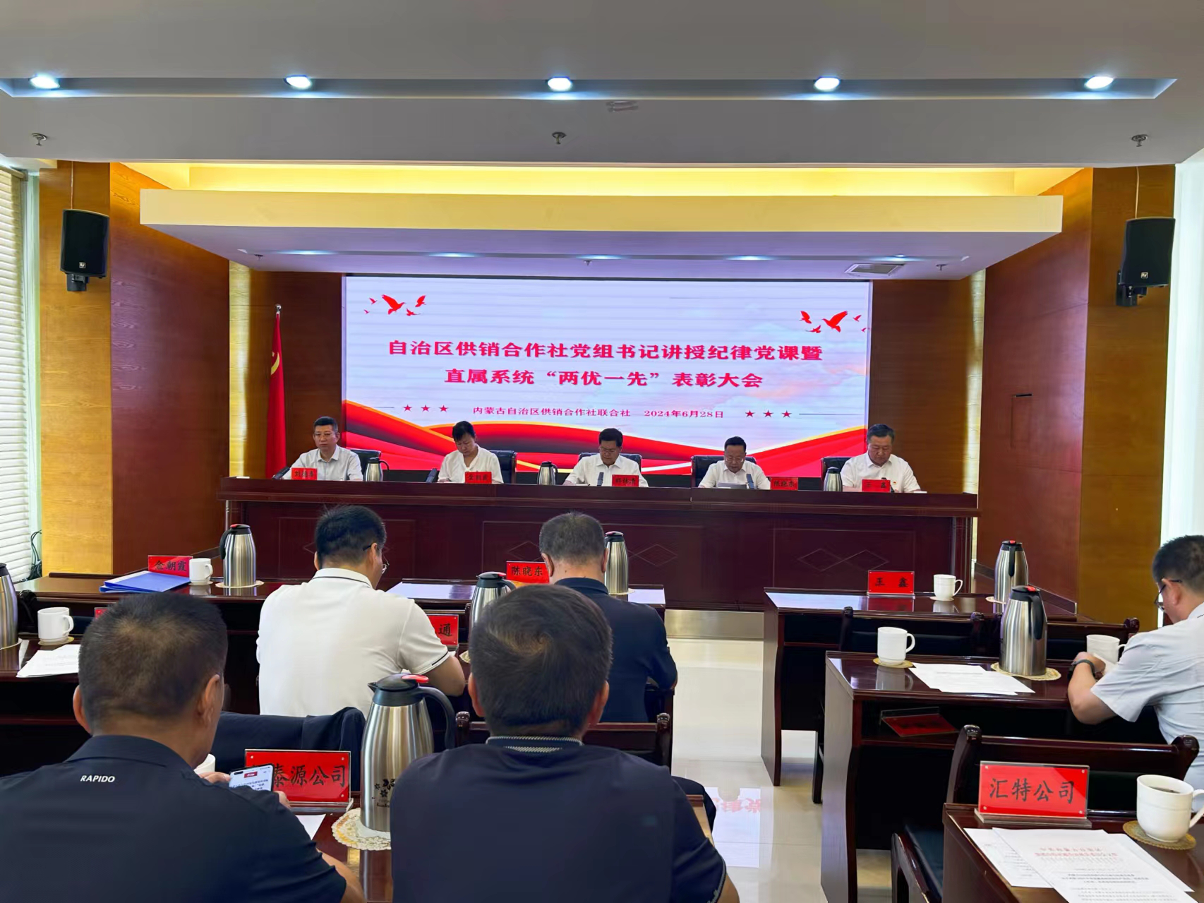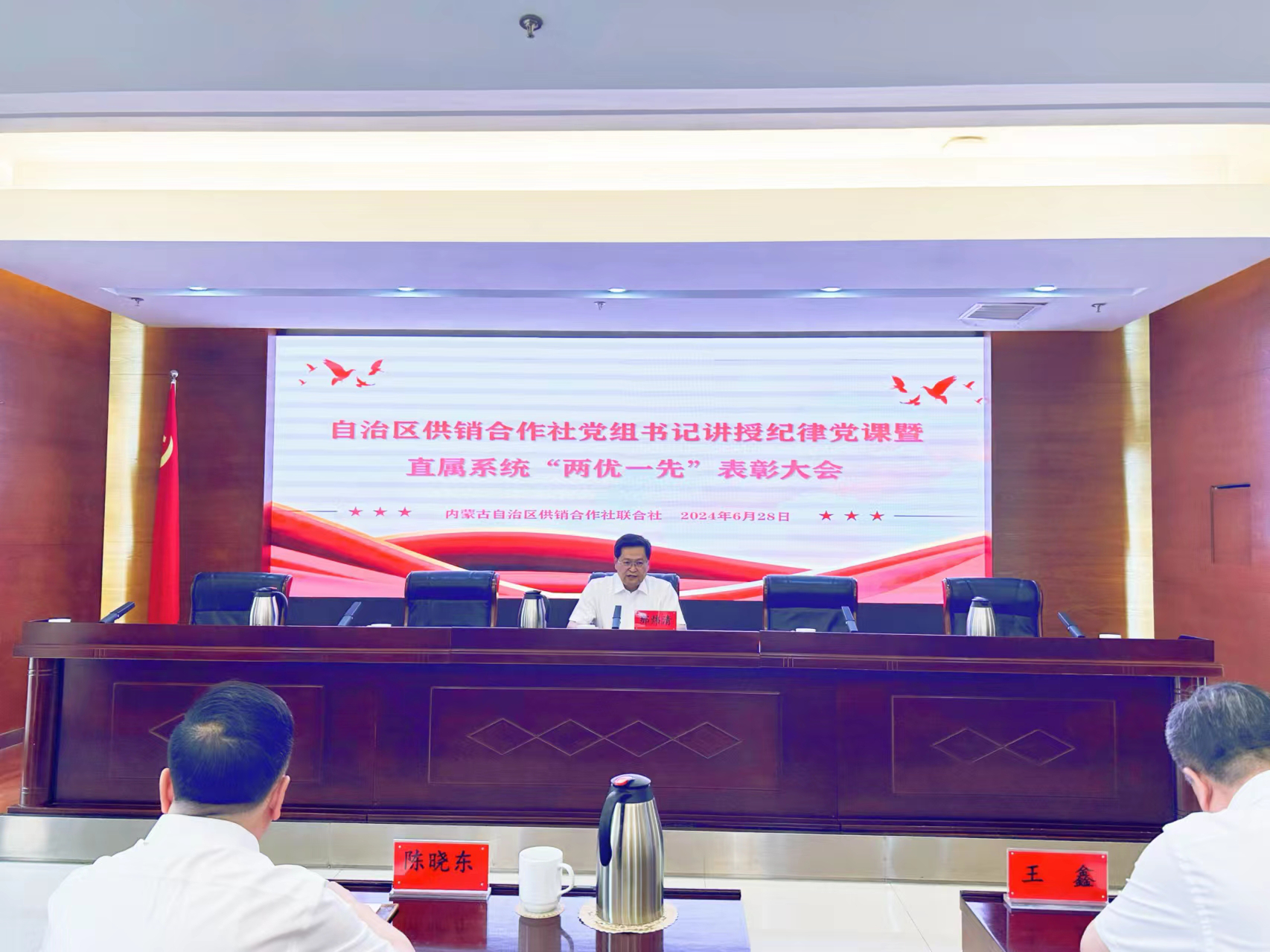 为热烈庆祝中国共产党成立103周年,扎实推进党纪学习教育,6月28日上午,自治区供销合作社召开党组书记讲授纪律党课暨直属系统“两优一先”表彰大会。区社党组书记、理事会主任那炜清专题讲授纪律党课,区社党组成员、监事会主任陈晓东主持会议,区社在家的领导班子成员、二级巡视员,区社机关全体党员干部、直属各单位领导班子成员参加会议。自治区党委直属机关工委党建第六片组杨红霞、刘岳到会指导。